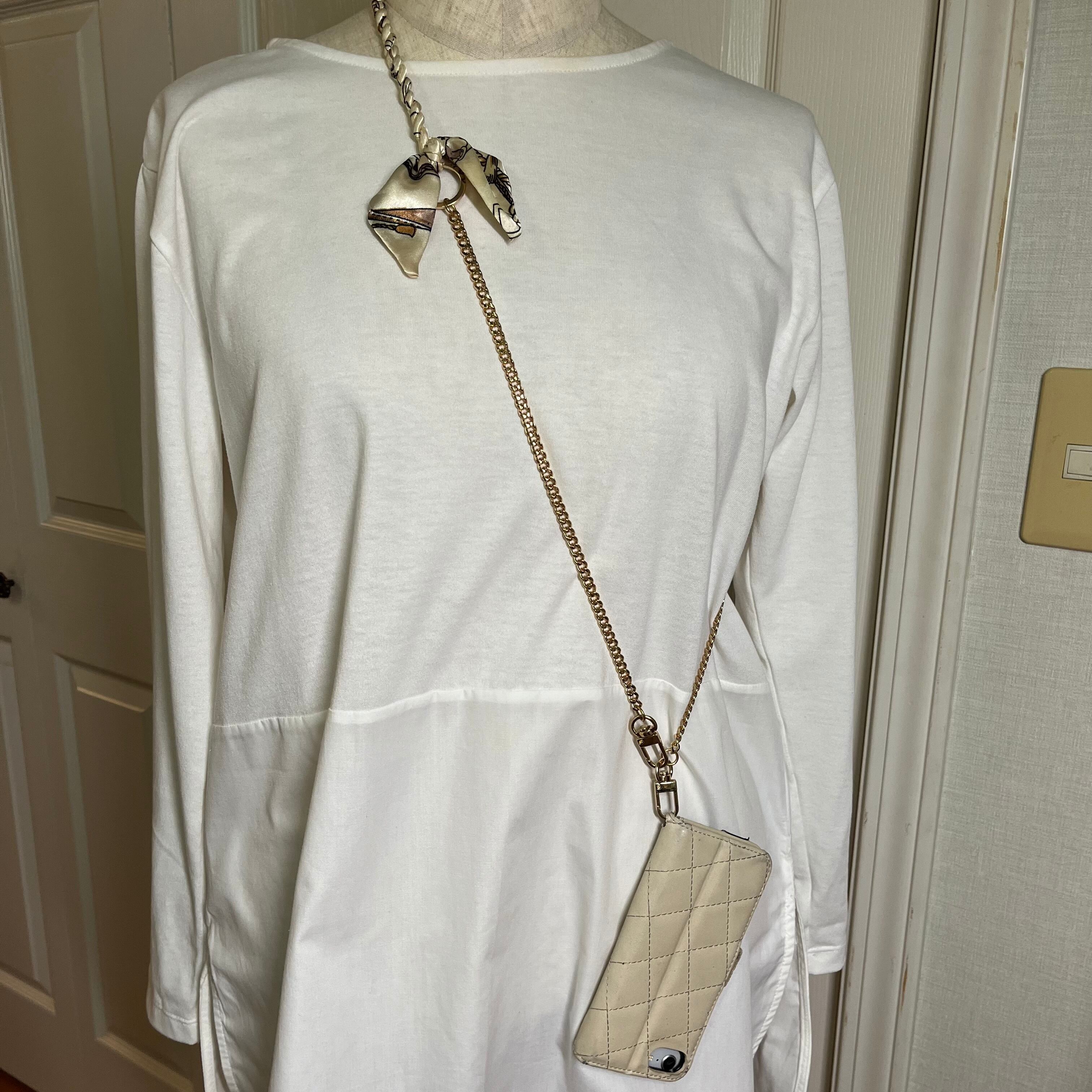 スカーフ生地とチェーンを組み合わせ、首回りは柔らかい生地を使用してます。カラーはピンクの柄にゴールドチェーン、ブラックの柄にシルバーチェーン、ベージュの柄にゴールドチェーンをあわせました。