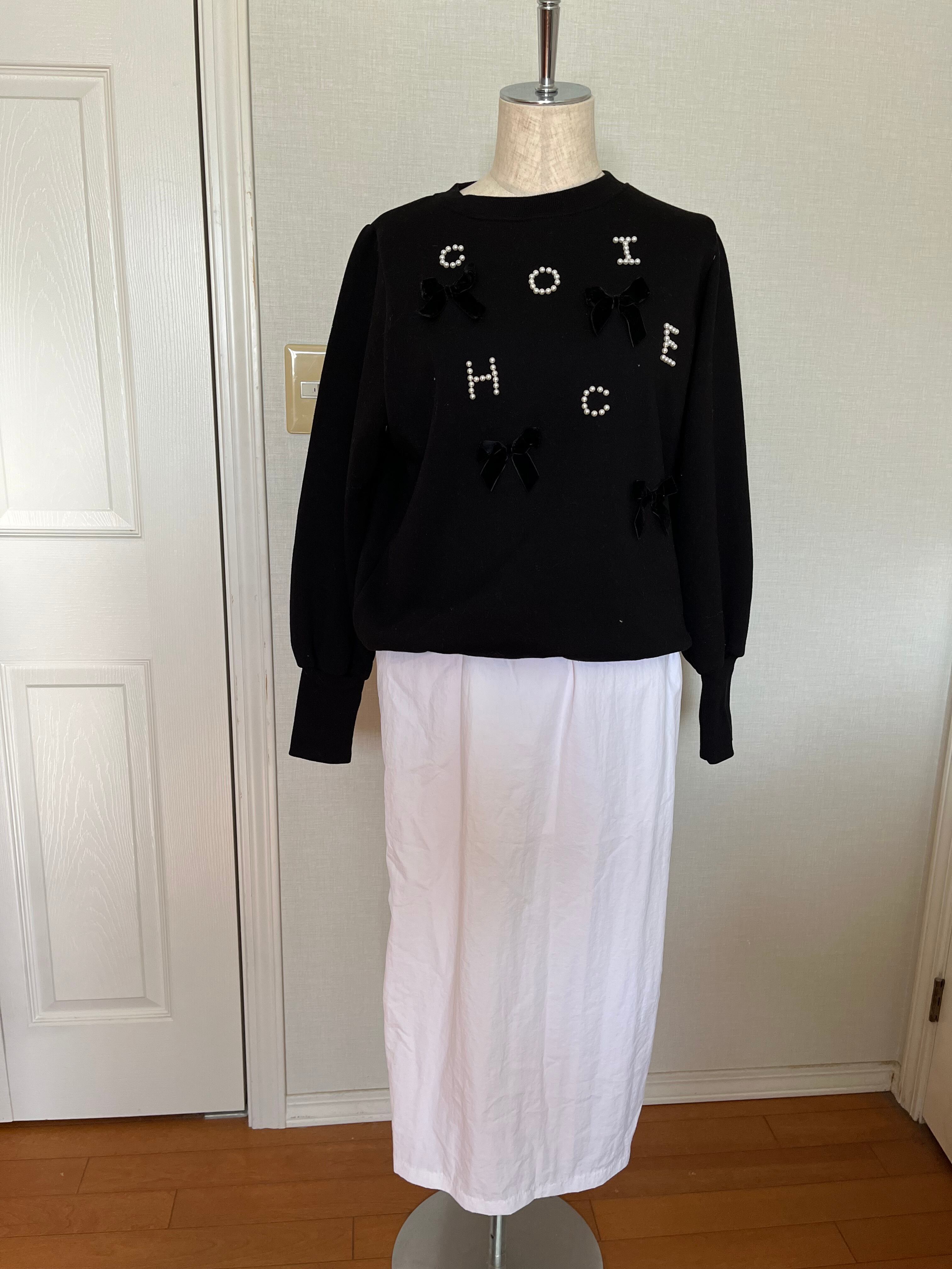 パールとリボンが可愛いく、袖の肩の部分はタックあります。裏起毛で暖かいです。 袖口はリブ編みでピッタリしてます。 フリーサイズになってます。